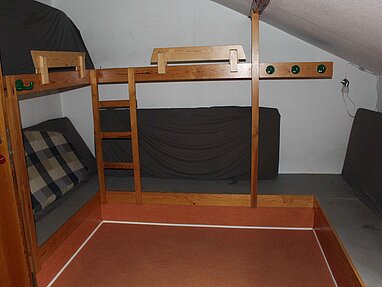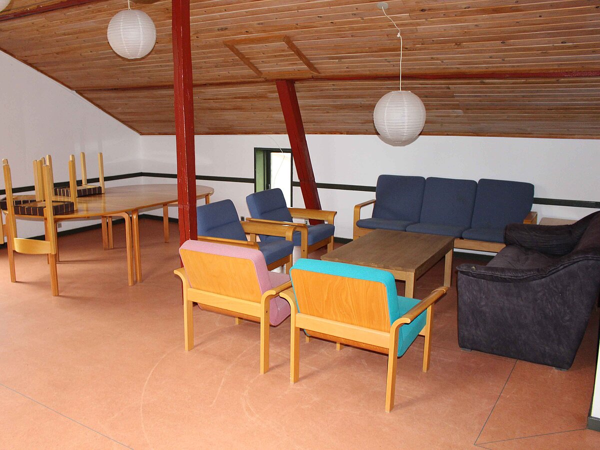 I Centerbygningen er der på 1. sal 40 overnatningspladser fordelt på 5 køjerum med plads til henholdsvis 5 personer (2 køjerum) og 10 personer (3 køjerum). På førstesalen er der ligeledes to opholdsrum. Et med sofaer, lænestole samt borde og stole og brændeovn. Her er der mulighed for masser af hygge og stille aktiviteter. Det andet er en rapos med borde og stole som blandt andet giver mulighed for at afholde møder eller arbejde i grupper.