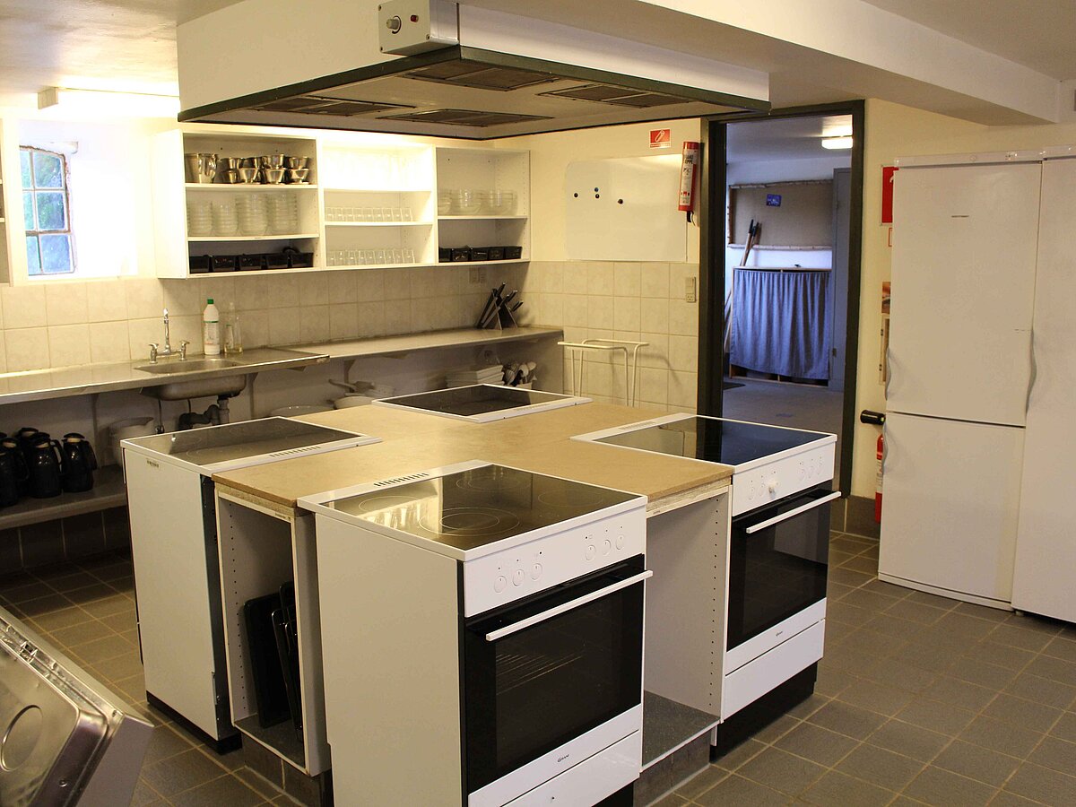 Køkkenet er stort og veludstyret med service (porcelænstallerkner, alm. bestik og glas) til ca. 60 personer. Derudover er der gryder, pander, køkkenknive osv. til madlavningen. Der er 4 komfurer og 4 ovne, to store køleskabe og opvaskemaskine. Ligeledes er der borde og stole i køkkenet til ca. 10 personer.